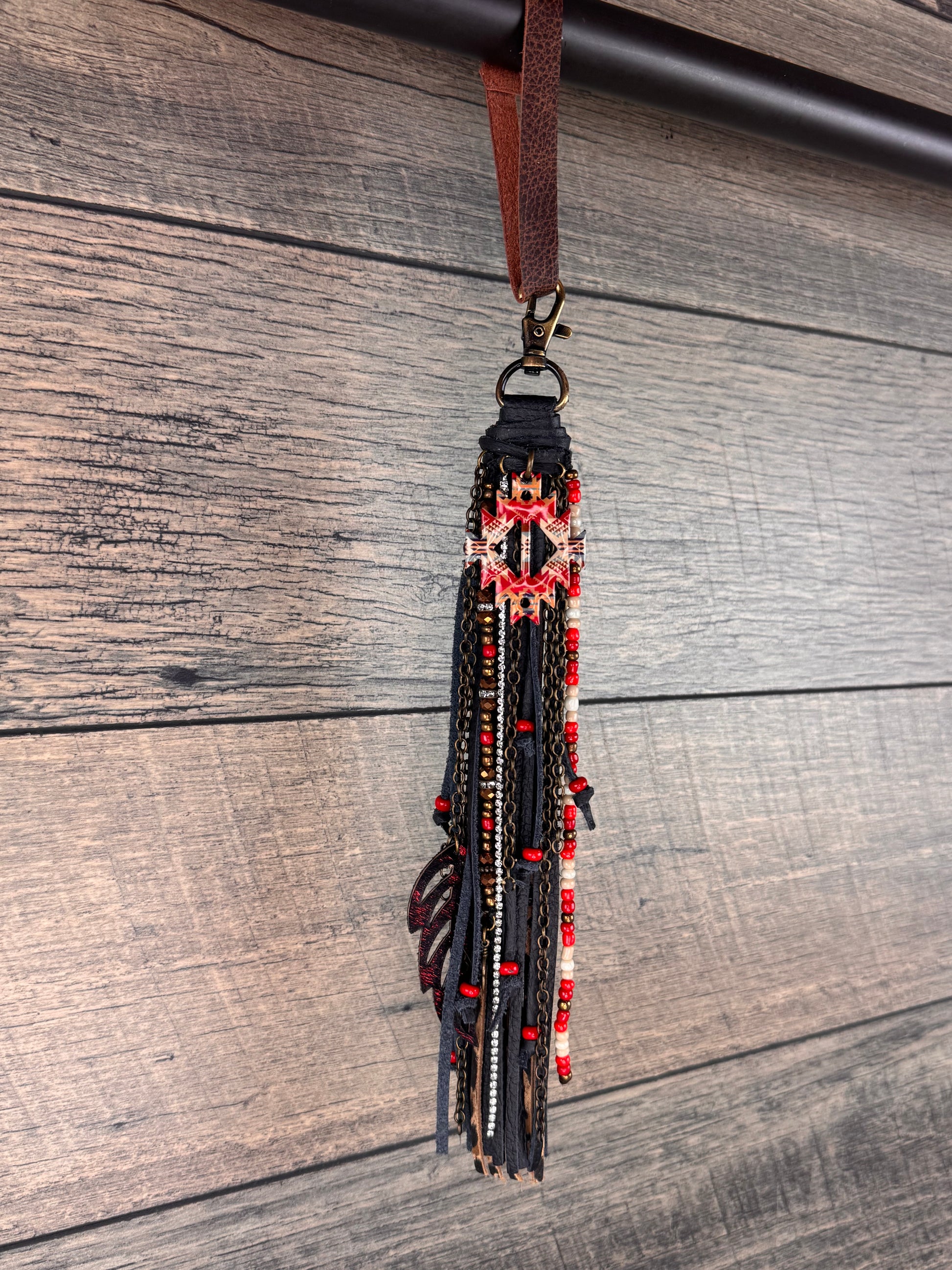 This tassel is handcrafted with beautiful neutral tone and red beads, antique brass chain, bronze metallic beads, feather accent charms, a red acid wash metallic feather, rhinestone chain, and finished with a little cheetah fringe and an Aztec pendant. This tassel is a beautiful mix of the classic red and black.