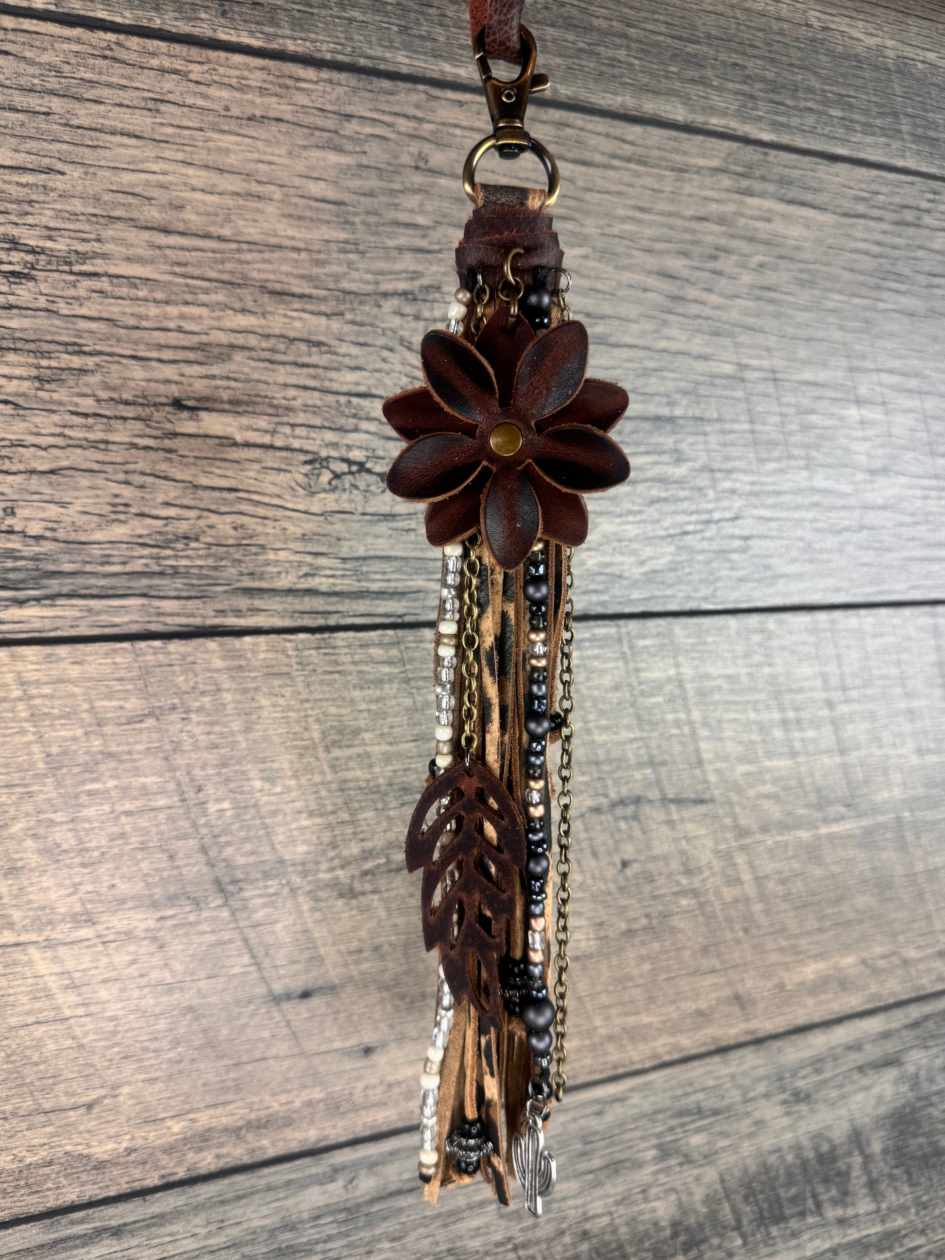 Leopard fringe, must we say more? STATEMENT PIECE. The leopard fringe, paired with the metallic gold, gunmetal and black beading, antique brass chains, leather flower charm, cactus charm and topped with one of our new leather flowers - WOWZA!